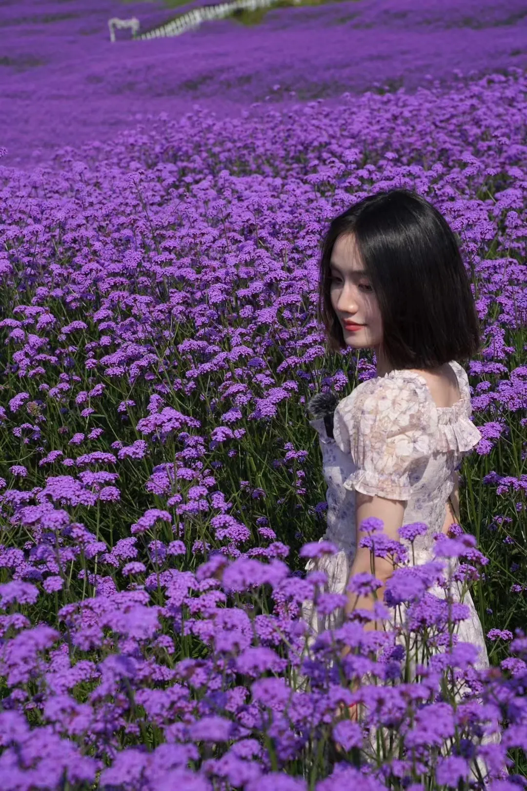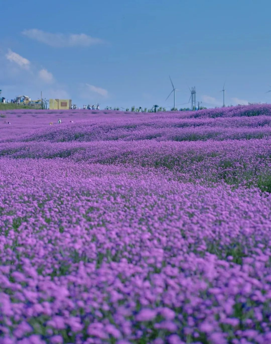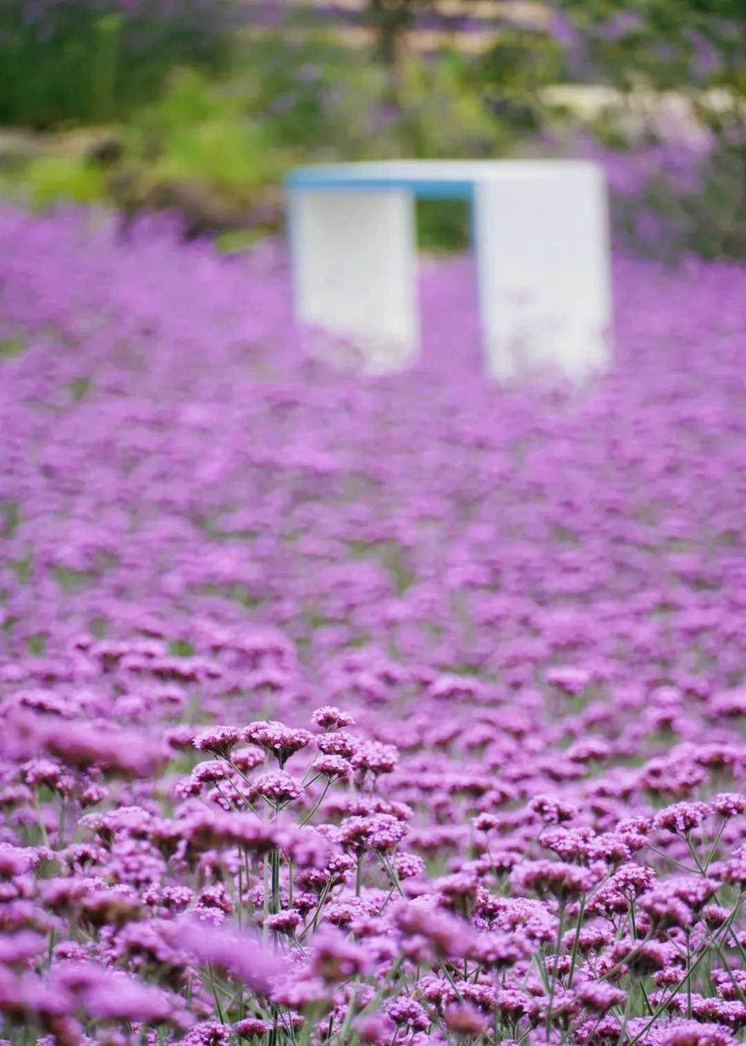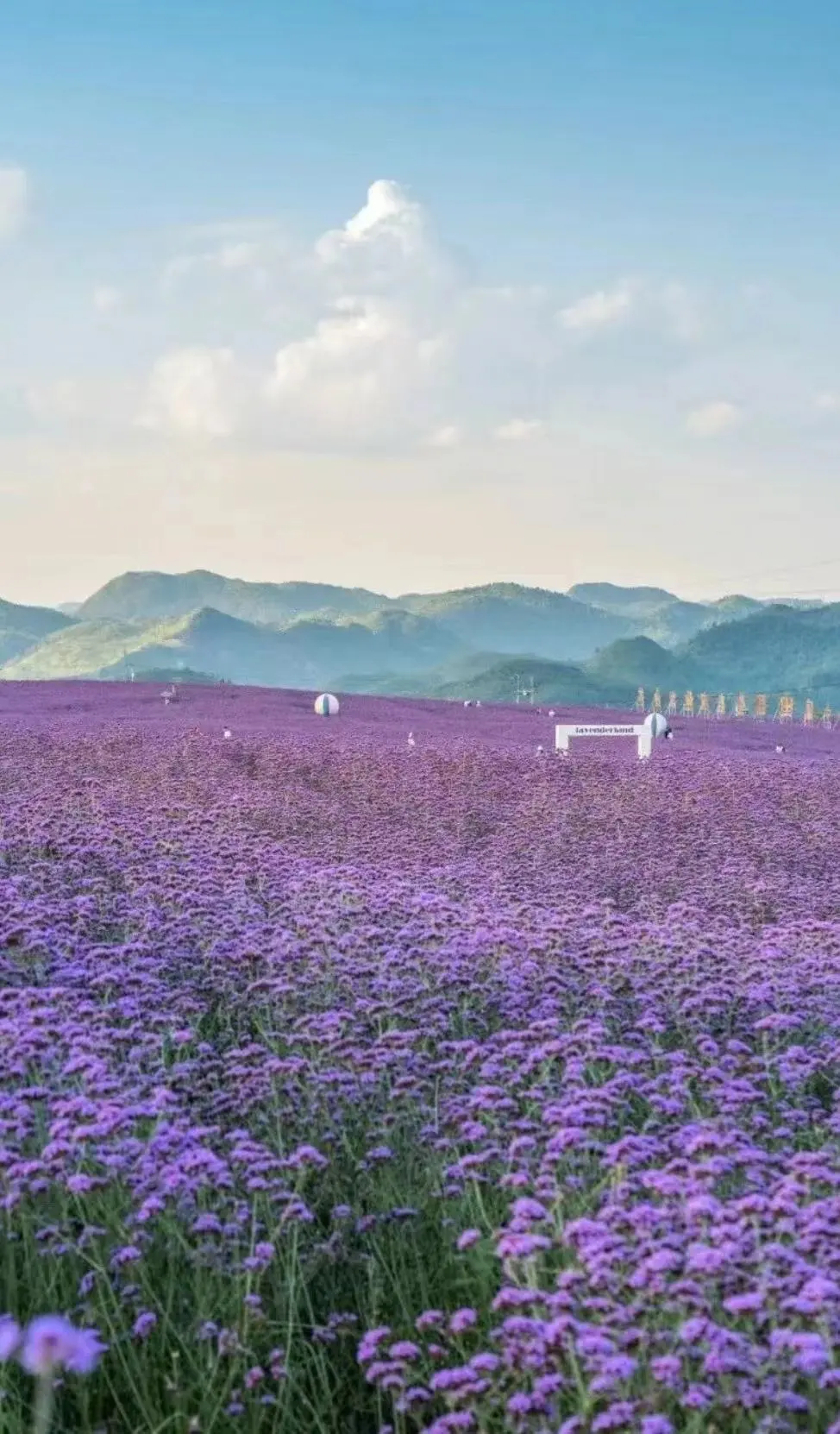 青山之间环绕一片绵密的马鞭草花海,远远望去,如同一张巨大的紫色地毯铺洒在绿意之中,让人心生爱怜。