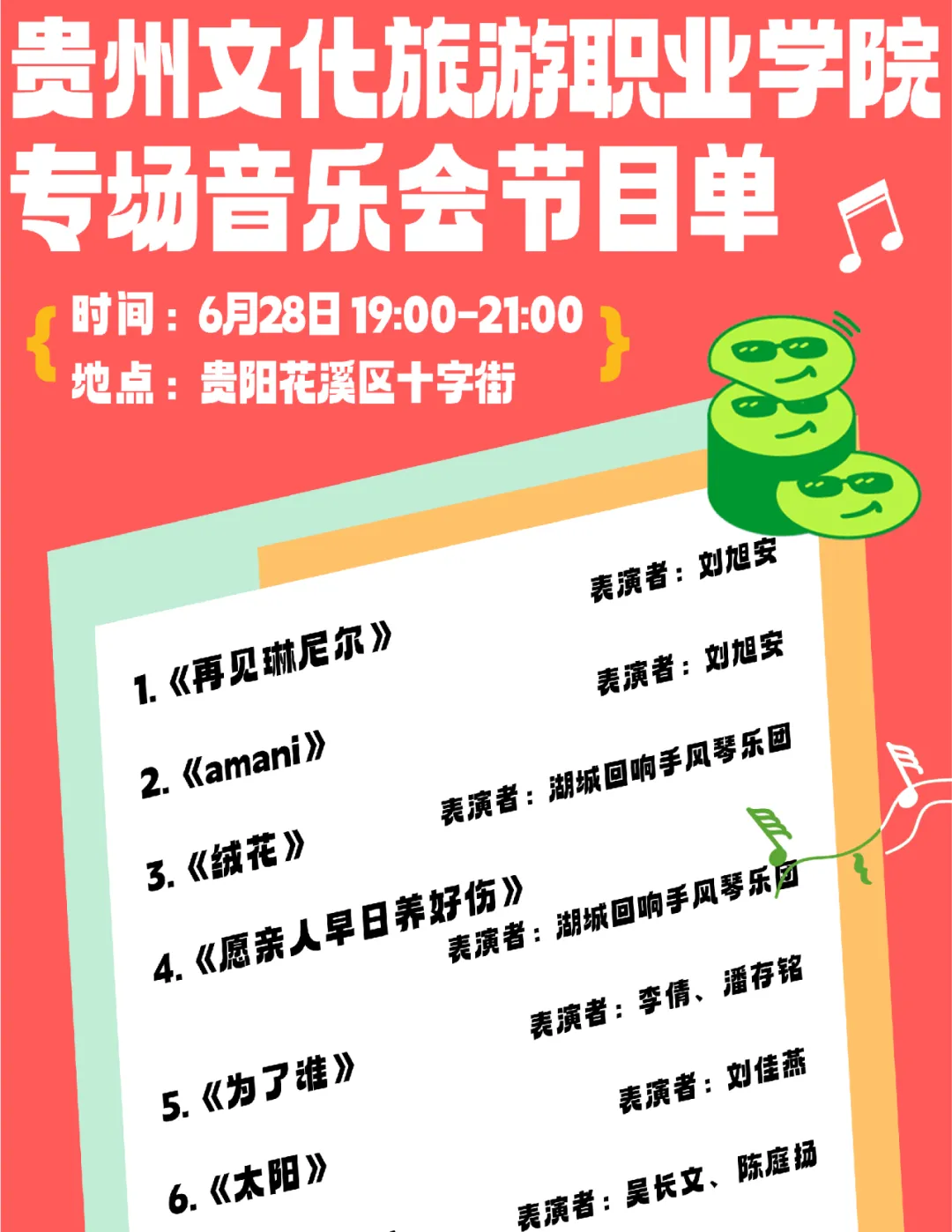 本周五晚,贵州文化旅游职业学院专场音乐会,强大的教师及学生阵容一起唱响夏日让热爱继续~