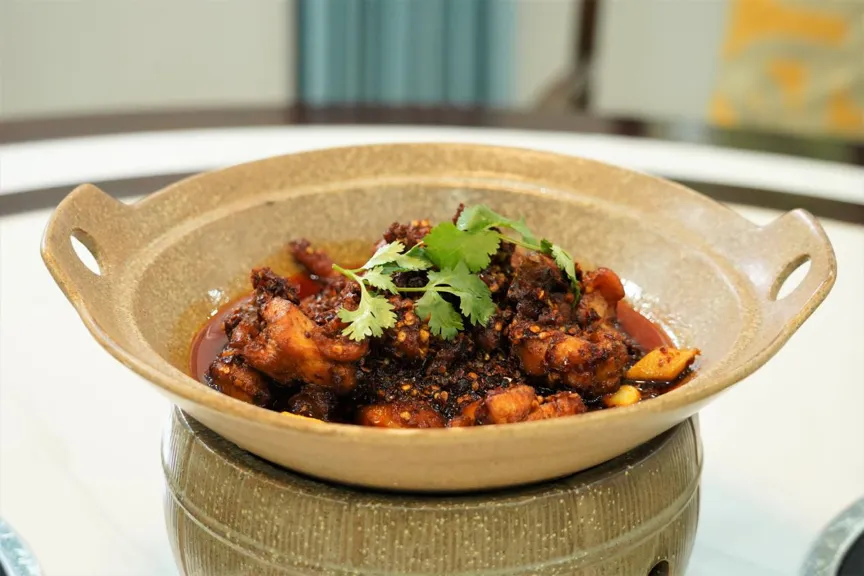 烧制入味:倒入煸好的鸡块,与辣椒油充分翻炒均匀。注入花椒、蒜、姜和少许冰糖、甜酒酿调味,翻炒让辣椒调料与鸡肉充分“贴合”。最后加入味精和盐,继续翻炒,等到厨房里香味扑鼻,这道特色辣子鸡就完成啦!