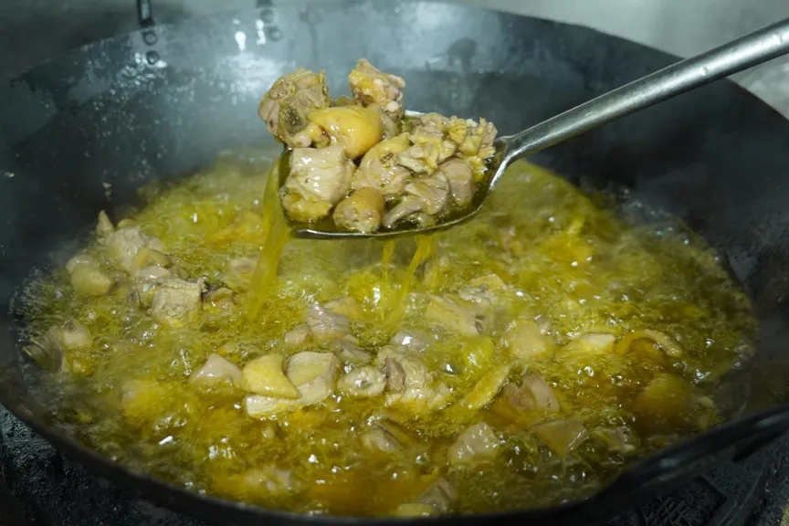 鸡肉预处理:鸡块加入葱、姜、盐腌制去腥。上锅倒油,将鸡块煸炒至表面金黄,盛出备用。
