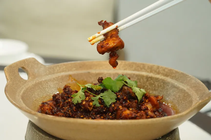 大口吃鸡,酣畅淋漓!糍粑辣椒经慢烧后,产生独特的酱香风味,让辣味变得柔和饱满,完全融入鸡肉纤维。鸡肉软糯入味,既保持了嚼劲,又饱吸辣椒精华,真正实现“你中有我,我中有你”的境界。一份辣子鸡,一碗白米饭,成了花溪人最踏实温暖的日常。