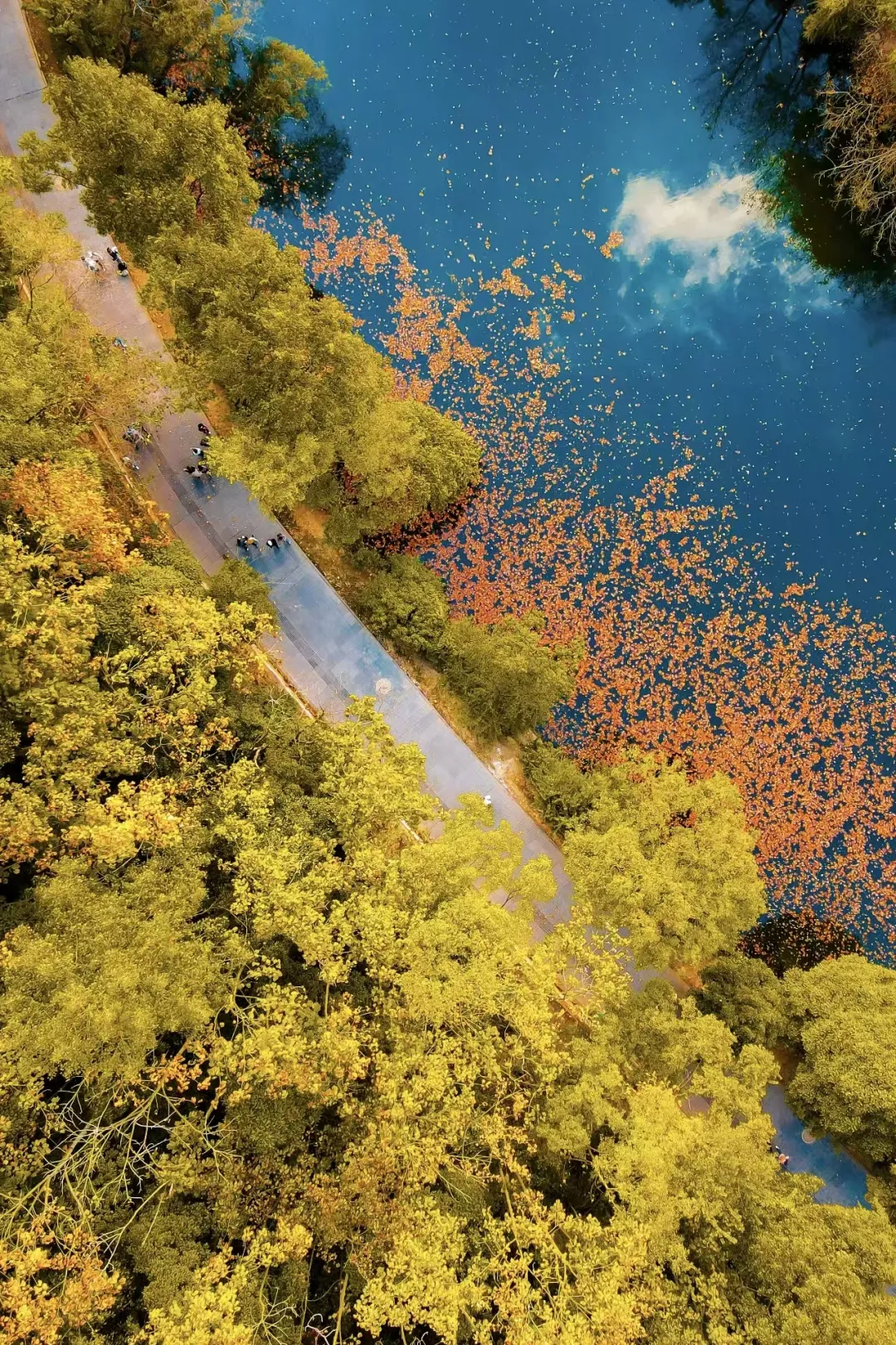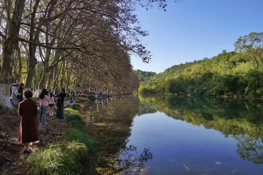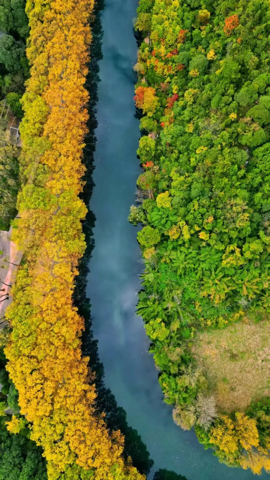 道路两旁高大的法国梧桐树叶渐次染金,落叶如毯,轻铺步道,与碧绿的河水相映成画,共同织就一幅静谧而诗意的秋日画卷。(来源:天眼新闻)