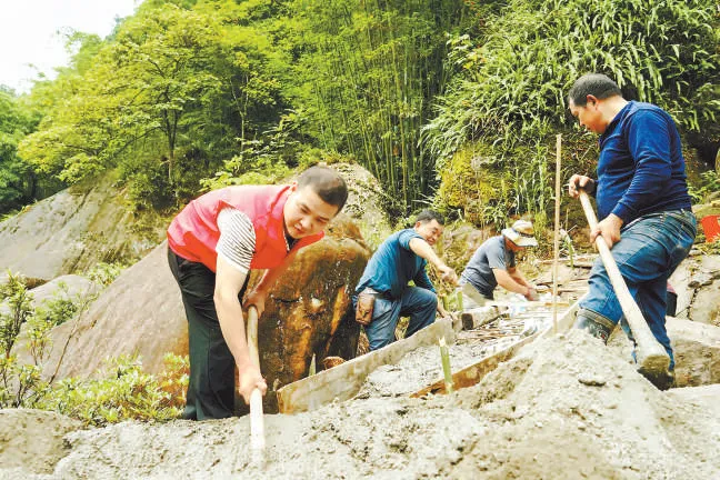 6月3日,在贵州赤水市葫市镇天堂村,驻村第一书记与群众修复被雨水冲毁的小桥。 吕宝珠 摄