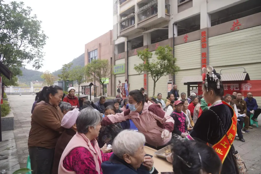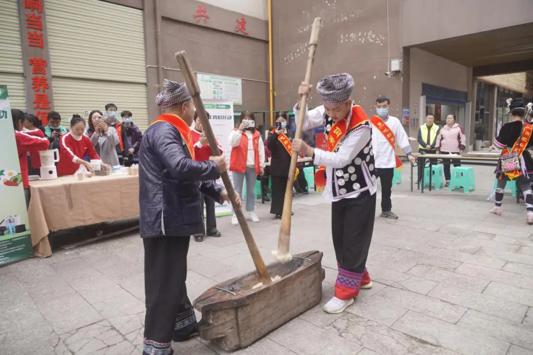 民俗文化广场上,社区工作人员组织居民们欢聚一堂,并为老年人送上精心准备的小礼物,传递着节日的温暖。爱心企业侗家工业餐厅带来了精彩的歌舞表演,并现场为居民打糍粑。通过这一重阳节传统民俗活动,瞬间吸引了众人目光。大家纷纷踊跃参与,亲手体验打糍粑的乐趣,分食糯食时,欢声笑语回荡在广场上空,邻里间的距离在温馨互动中进一步拉近。