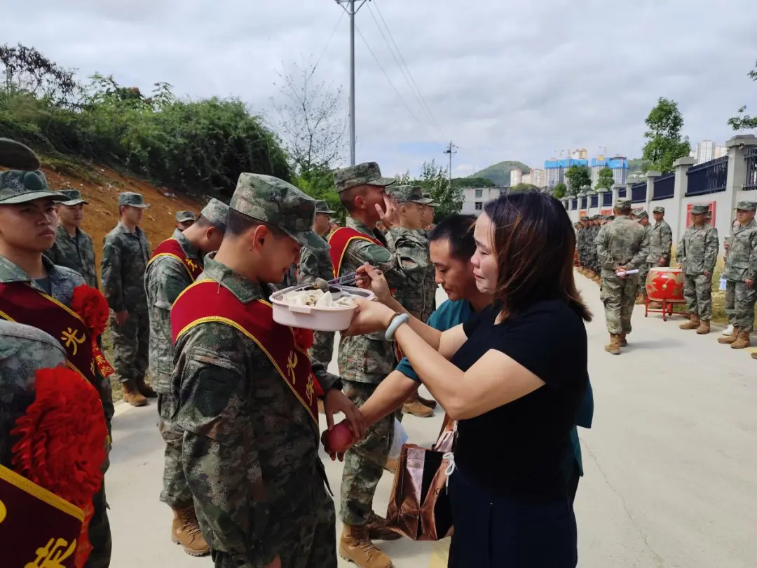 殷殷嘱托,浸润心田。临行前,新兵家属们纷纷围绕在孩子身边,既自豪又不舍,一字一句尽是关心与鼓励。“到了部队要听从指挥,团结战友,好好表现。家里一切都好,不用惦记,我们等你立功的喜讯!”寓意吉祥的饺子、象征平安的苹果,承载着家人的深情厚望,成了传递深情的特殊信物。家长们将热气腾腾的饺子喂到新兵口中,把一个个苹果塞满孩子的行囊,暖暖亲情与浓浓家国情怀在此刻交汇。