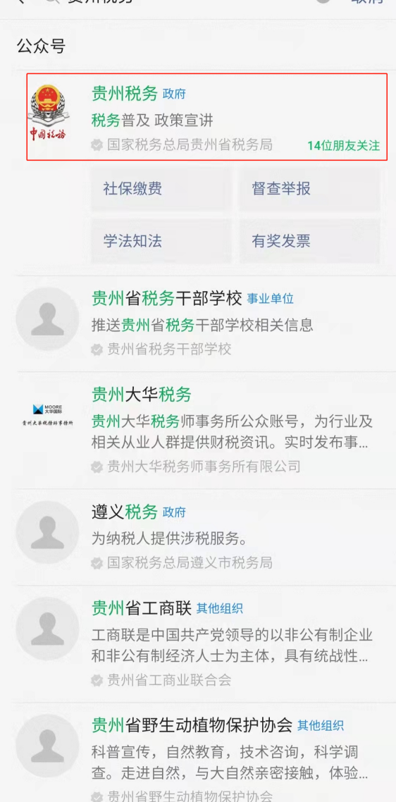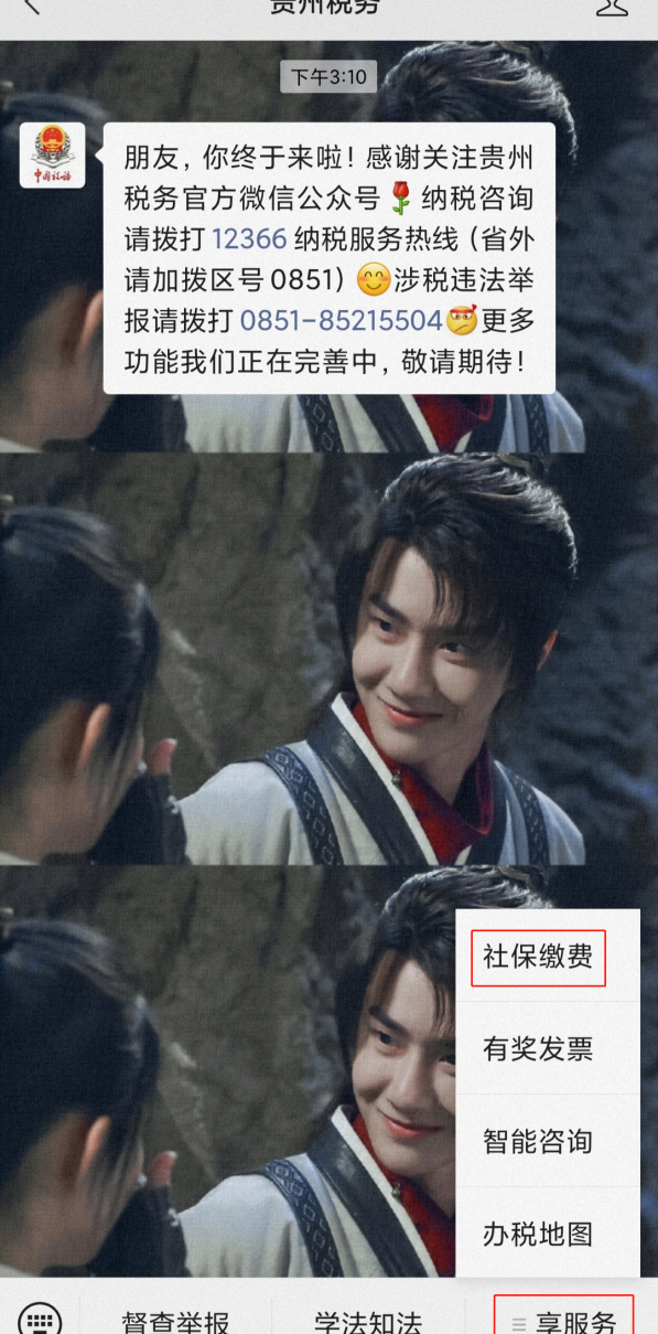 (三) “贵州税务”微信公众号。关注“贵州税务”微信公众号后,在下方导航栏里依次选择“享服务”→“社保缴费”,根据提示输入人员身份、险种、缴费金额等信息后完成支付。