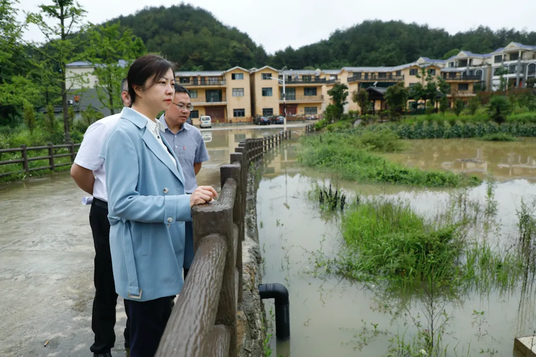 在青岩镇二关村,蒋芳菊实地查看安置房周边积水情况,现场督导排水和应急防汛工作。她指出,要加强救灾应急,加大投入设施设备、增加人员力量,及时清淤疏浚,把灾情影响降到最小。要细化防汛预案,做好物资保障、人员保障,强化应急调度,扎实做好防汛工作。