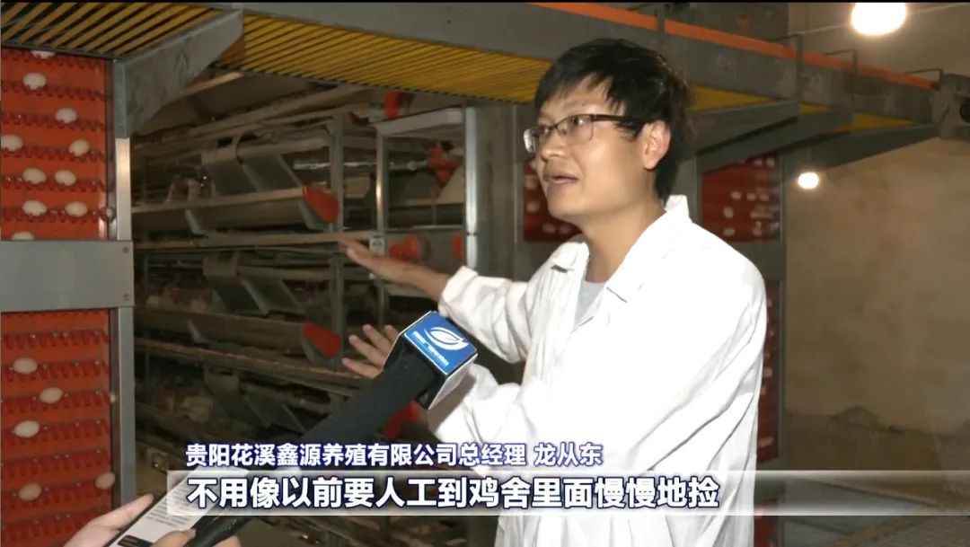 贵阳花溪鑫源养殖有限公司总经理 龙从东:在农业农村局的支持下,我们以前的老旧设备全部已经更新换代了,环境温度、湿度、二氧化碳,包括一些数据,能够全自动地控制,中央集蛋机用传送带传输过来,统一包装,不用像以前要人工到鸡舍里面慢慢地捡。