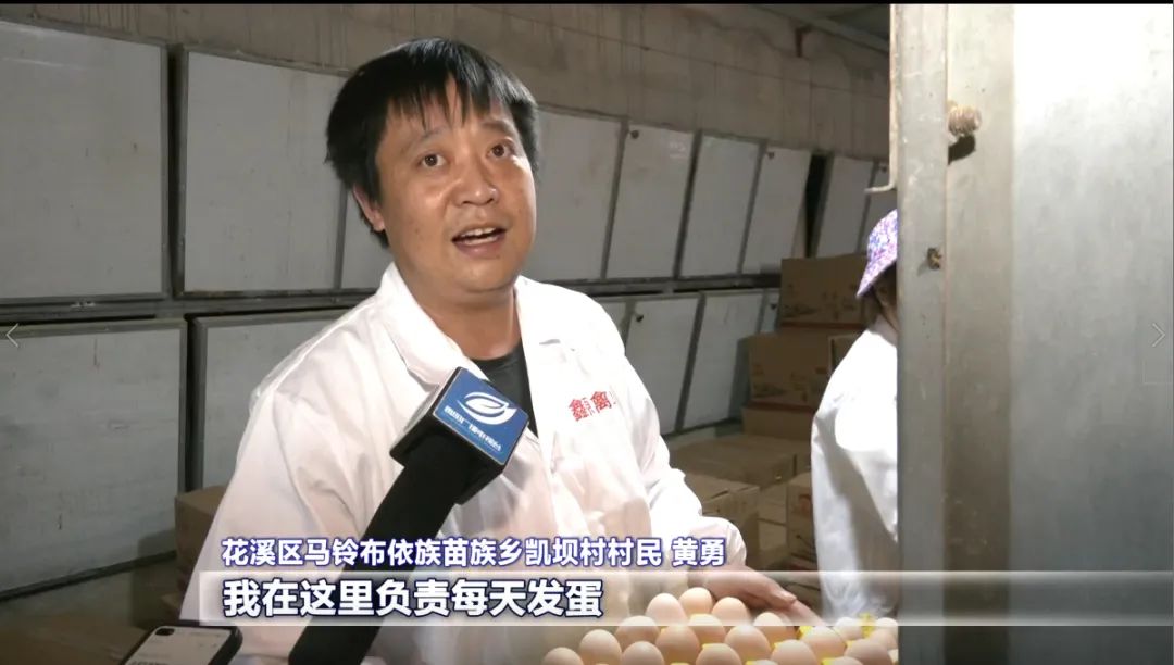 花溪区马铃布依族苗族乡凯坝村村民 黄勇:我在这里负责每天发蛋,现在捡蛋比较方便,装箱以后,称重就发出去了,每天都是很新鲜的蛋。