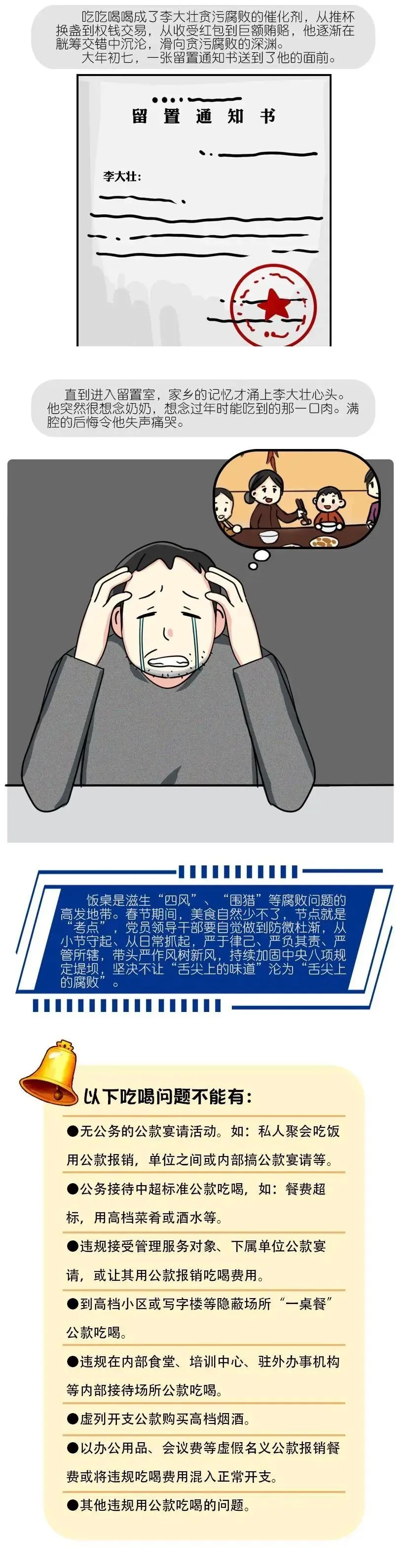 饭桌是滋生“四风”“围猎”等腐败问题的高发地带,党员干部要自觉做到防微杜渐,从小节守起,严于律己,坚决不让“舌尖上的味道”变成“舌尖上的腐败”。