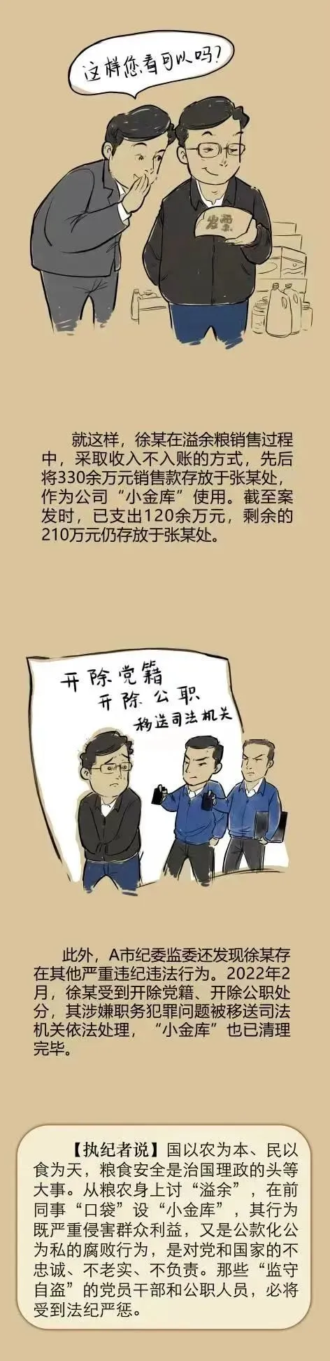 国以农为本,民以食为天。在前同事“口袋”设“小金库”,其行为严重侵害群众利益,又是公款化公为私的腐败行为,是对党和国家的不忠诚、不老实、不负责。