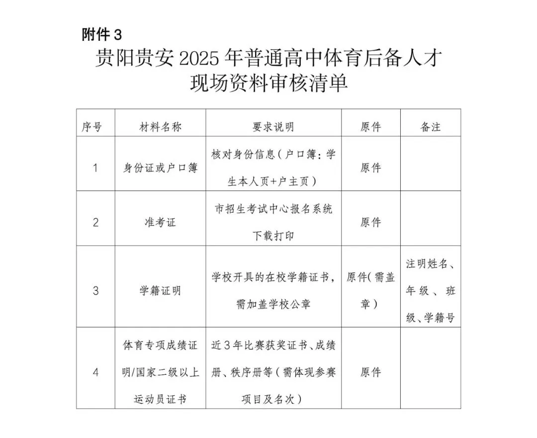 7月1日-2日,市教育局、市体育局对预录取考生报名资料进行现场审核详见附件3《贵阳贵安2025年普通高中体育后备人才现场资料审核清单》,审核地点:贵阳市体育中学(贵阳市云岩区东新路32号)。