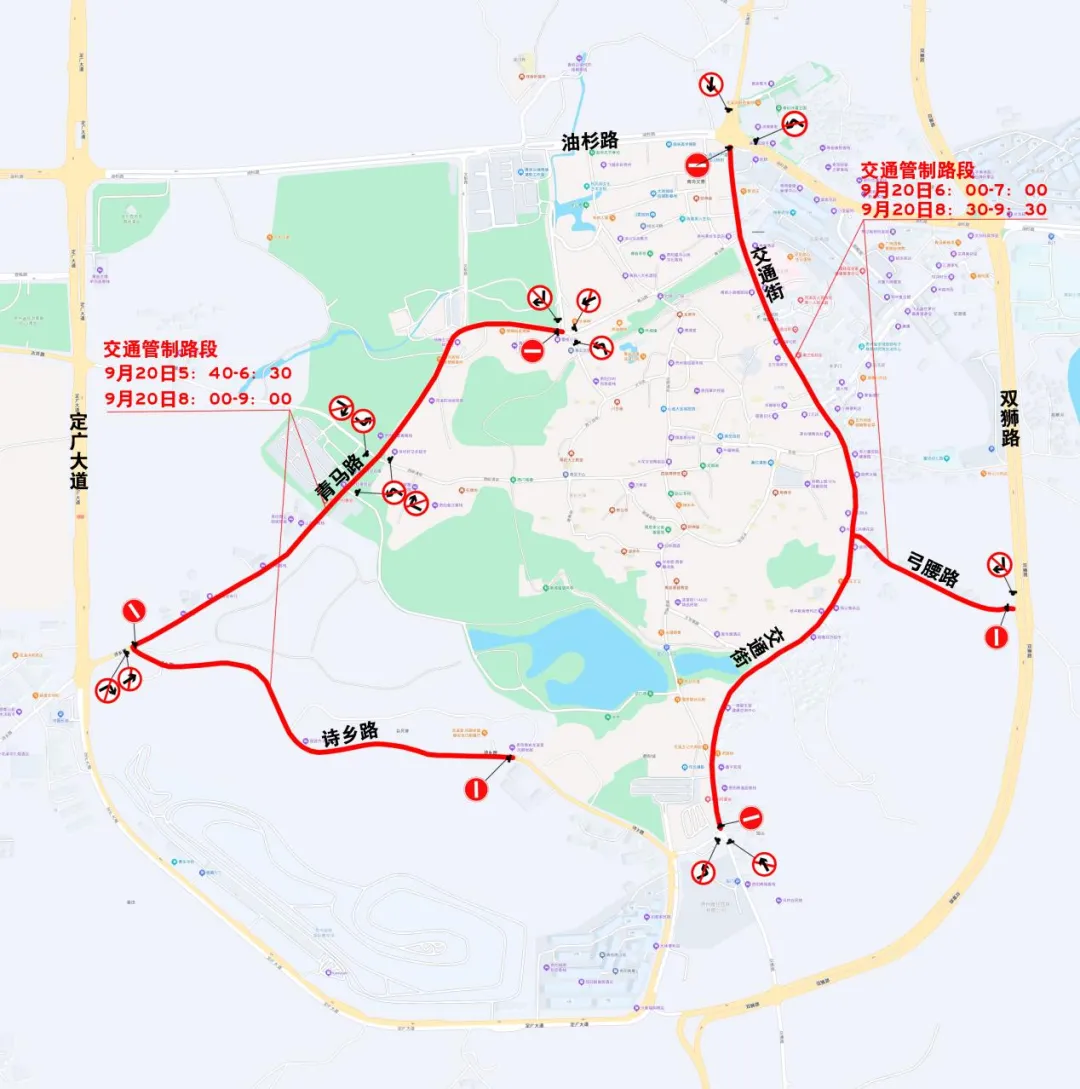1、青马路(青岩古镇北门广场至青马路与诗乡路交叉口)、诗乡路(青马路与诗乡路交叉口至龙溪里·凤颐岩居广场)。管制时间:9月20日5:40-6:30,8:00-9:00。