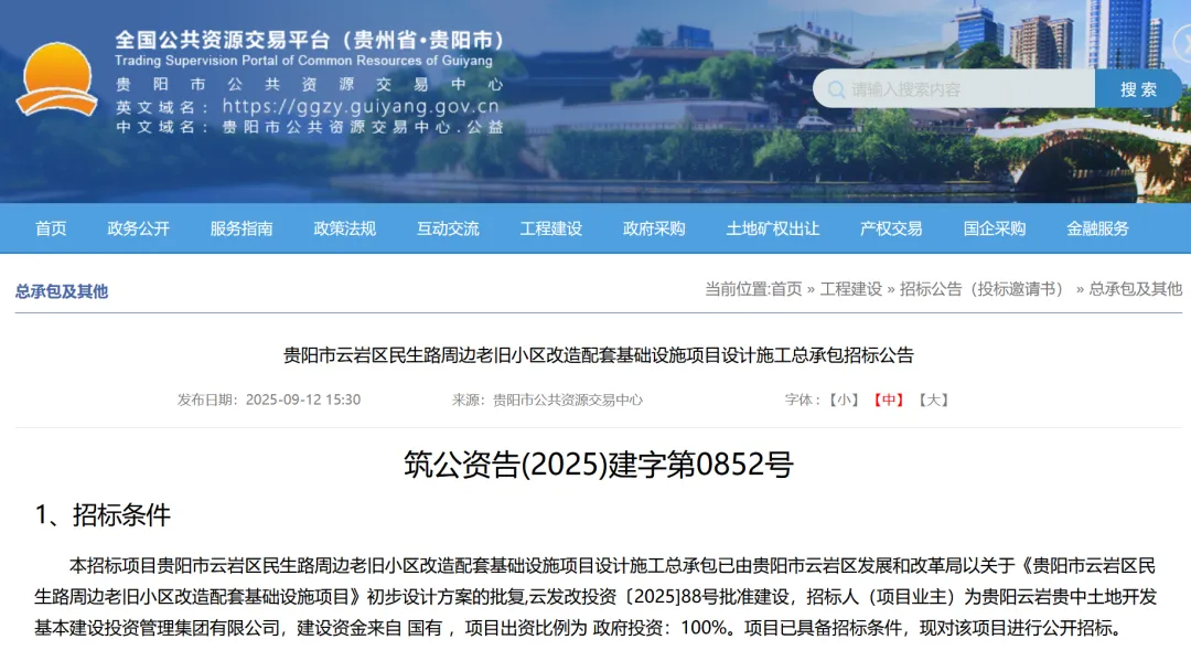 9月12日,贵阳市公共资源交易中心发布贵阳市云岩区民生路周边老旧小区改造配套基础设施项目设计施工总承包招标公告。
