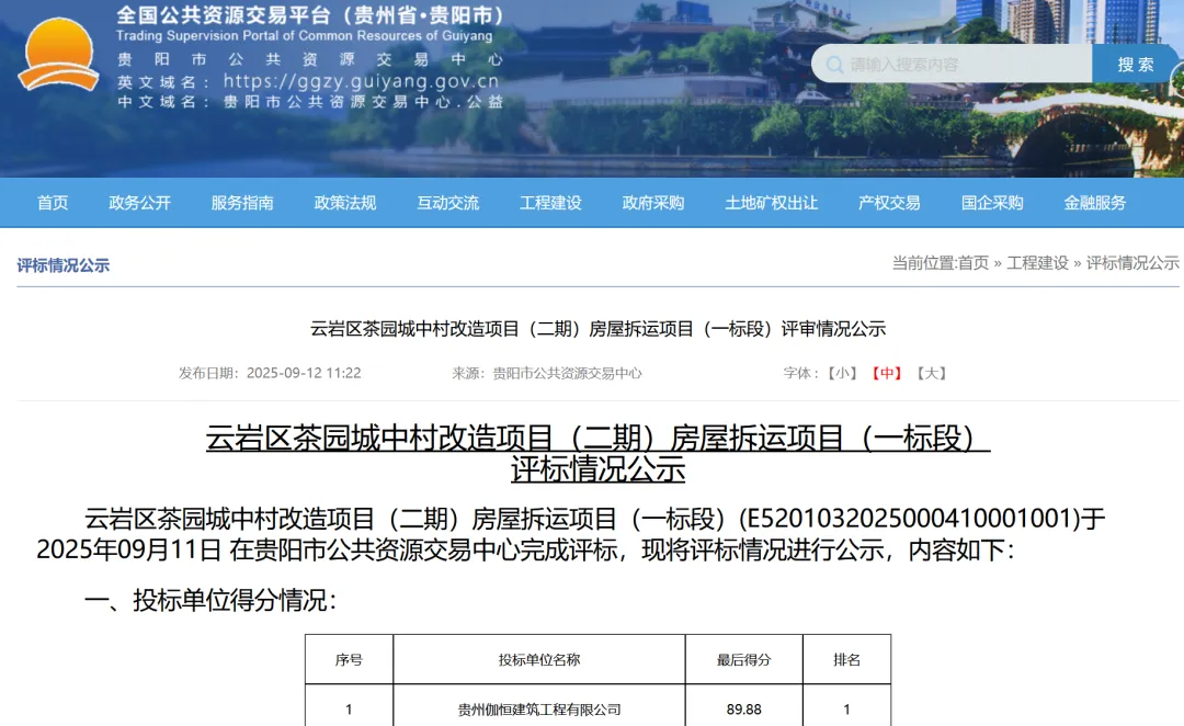 9月12日,贵阳市公共资源交易中心发布云岩区茶园城中村改造项目(二期)房屋拆运项目(一标段)评审情况公示。