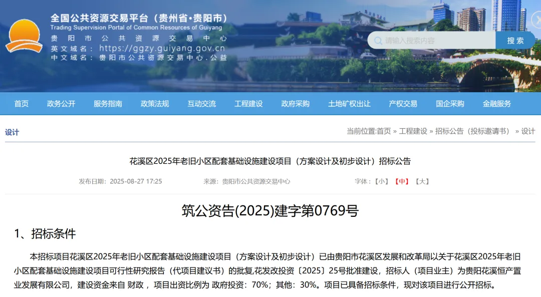 8月27日,贵阳市公共资源交易中心发布花溪区2025年老旧小区配套基础设施建设项目(方案设计及初步设计)招标公告。