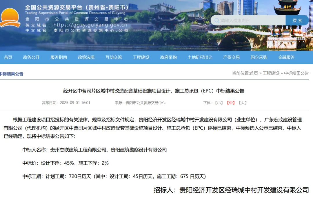 9月1日,贵阳市公共资源交易中心发布经开区中曹司片区城中村改造配套基础设施项目设计、施工总承包(EPC)中标结果公告。