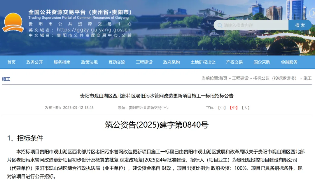 9月12日,贵阳市公共资源交易中心发布贵阳市观山湖区西北部片区老旧污水管网改造更新项目施工一标段招标公告。