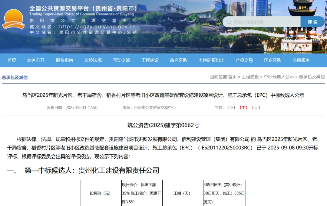 9月11日,贵阳市公共资源交易中心发布乌当区2025年新光片区、老干部局宿舍、稻香村片区等老旧小区改造基础配套设施建设项目设计、施工总承包(EPC)中标候选人公示。