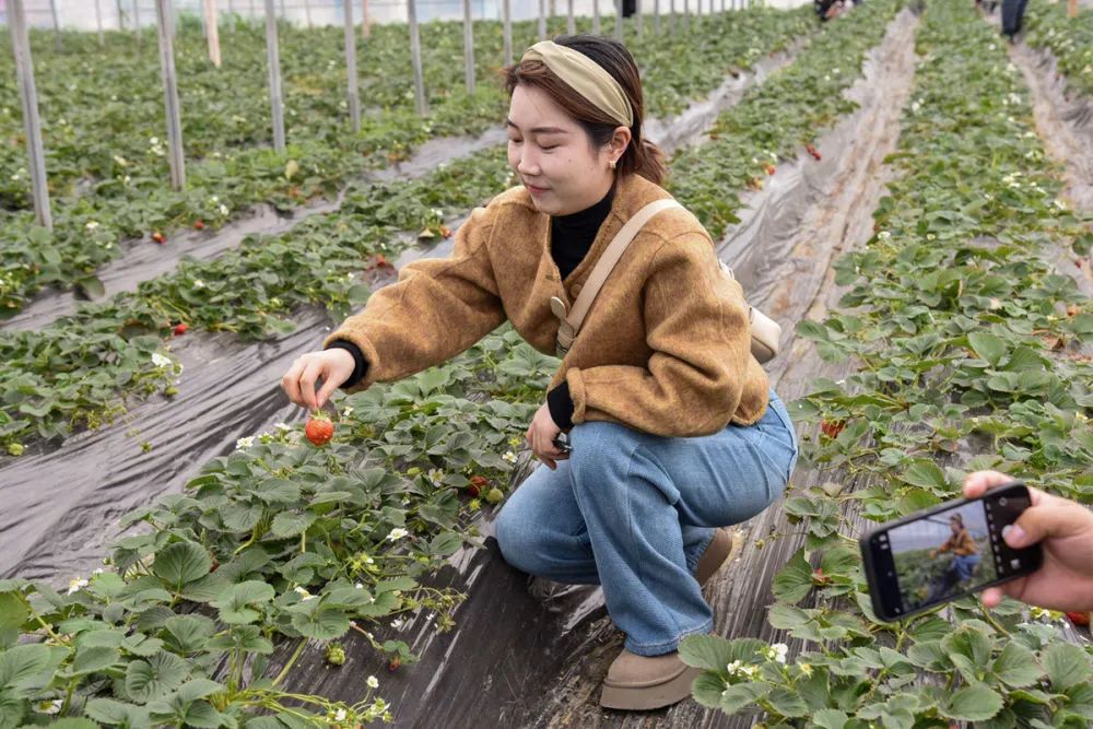 1月16日,贵阳市花溪区富硒有机草莓示范基地游客在打卡拍照(李瑞 摄)
