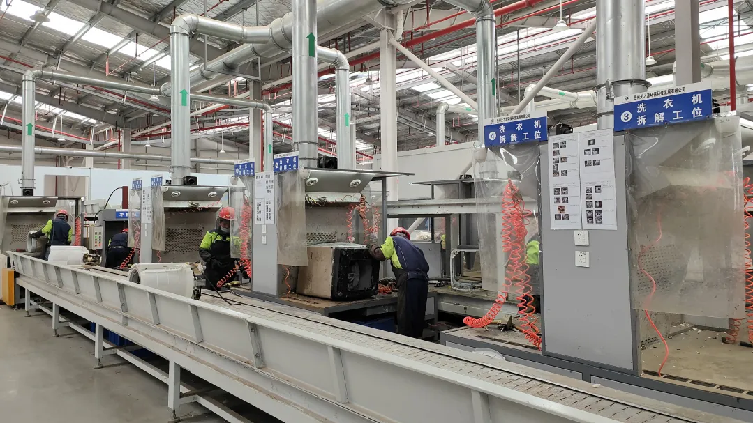 伴随轰鸣的机器声,历经拆解、破碎、装袋等多道工序,每年约有550万台废旧电器电子产品和其他小家电在这里被科学回收处理,实现处理的再循环和资源化利用。