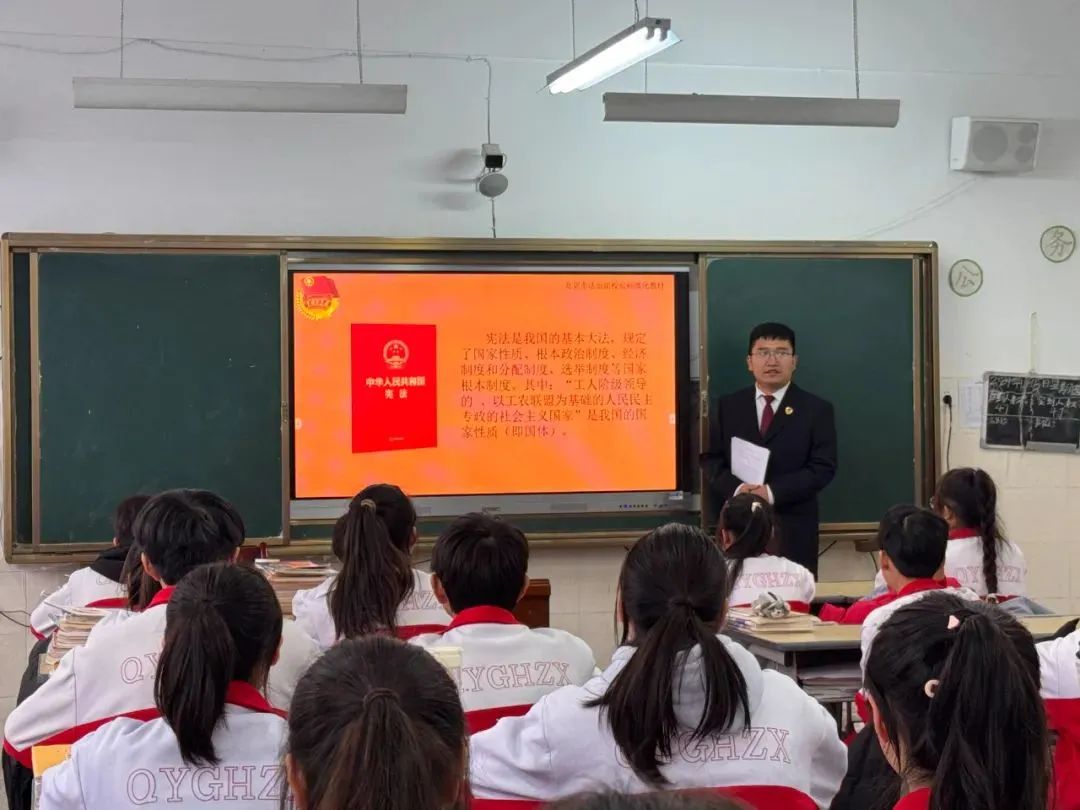在贵璜中学,检察干警采用通俗易懂的语言,分别从国家宪法日、宪法的概念、作用、公民的基本权利及基本义务等角度出发,向同学们讲解了宪法的相关知识,形象生动地将宪法比作房子的地基,让同学们深刻理解宪法在我国法律体系中的根基地位。