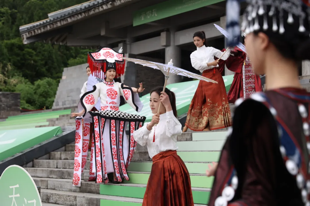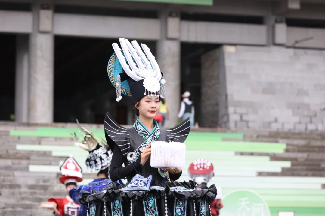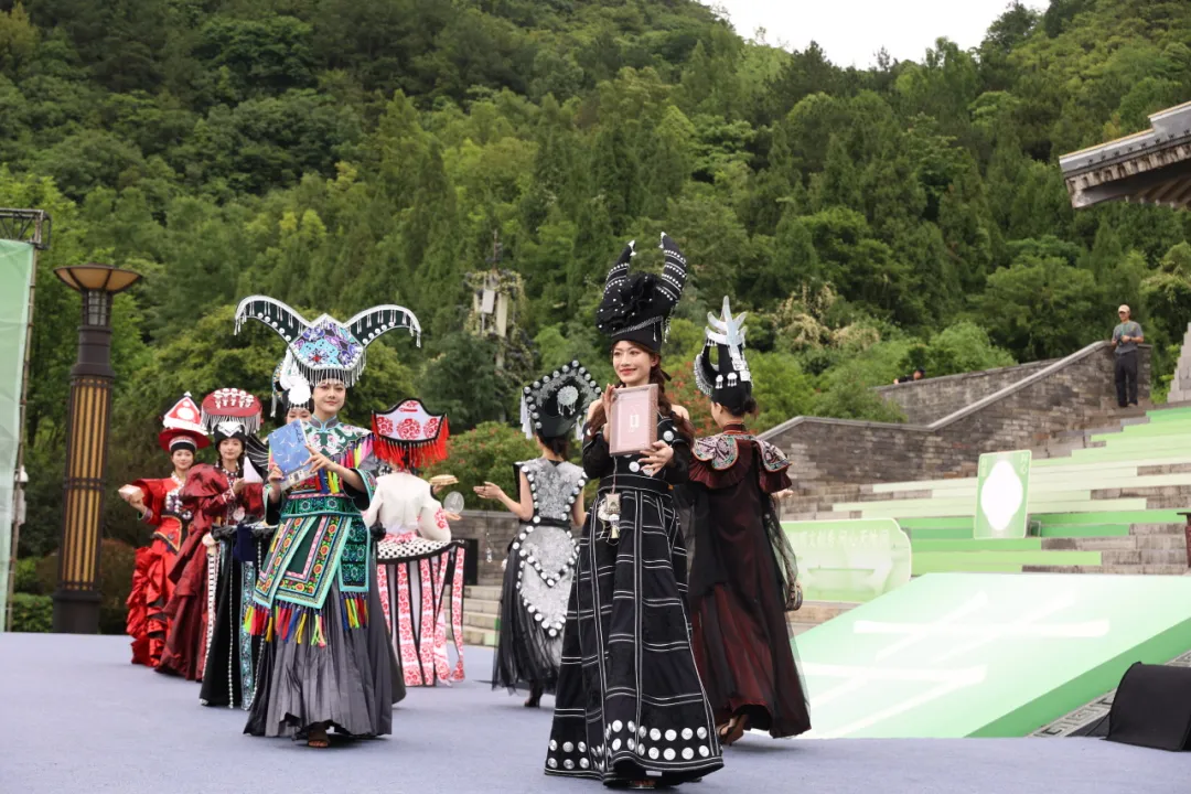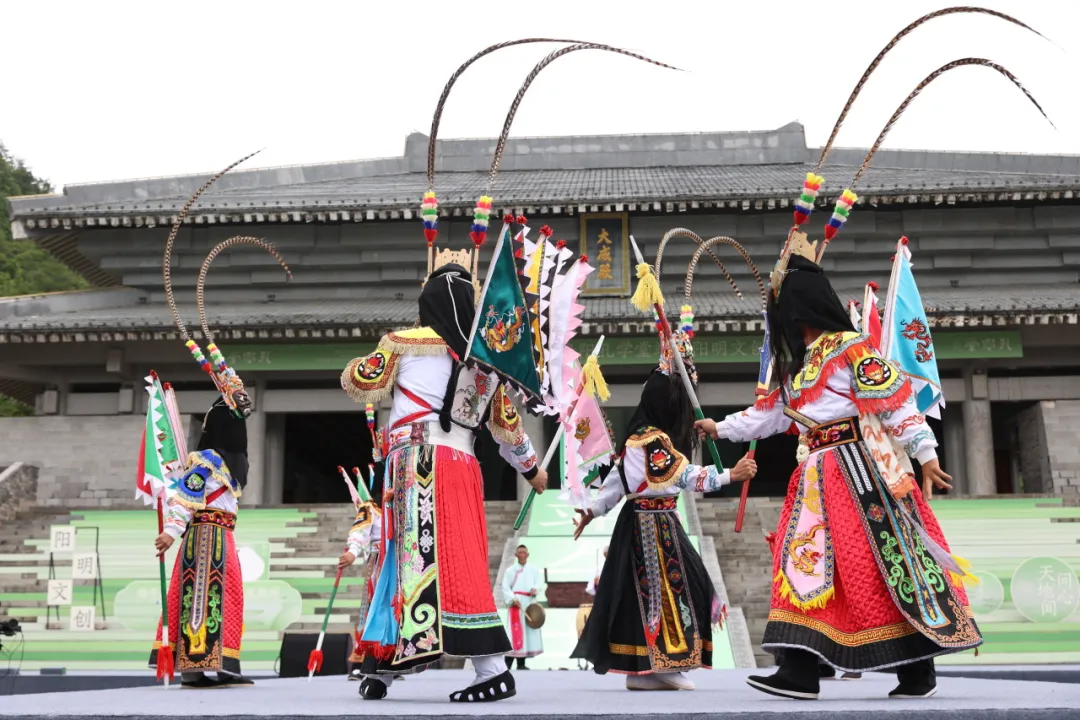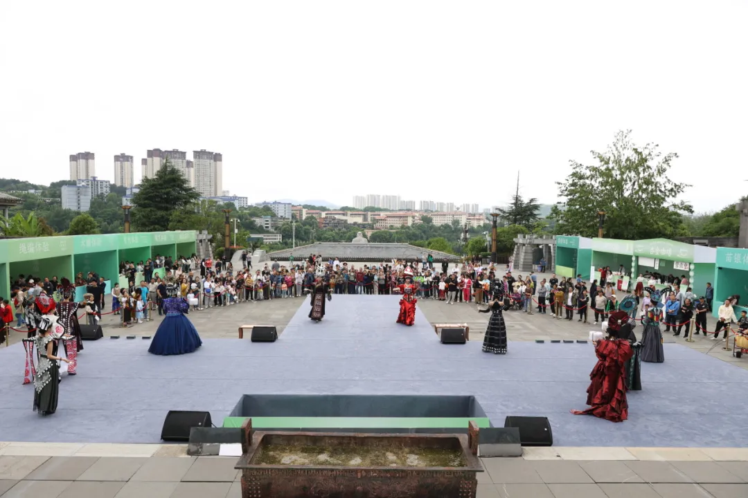表演尚未开始,已经有不少市民聚集在孔学堂礼仪广场,在大家的翘首以盼中,迎来第一篇章多彩风《江畔寻歌》,两位舞者扮演王阳明与屈原,在大成殿前的舞台以舞姿遥相呼应。不多时,10名身穿贵州少数民族元素服饰的模特从大成殿缓步走向舞台,民族服饰T台秀与现代舞共同演绎,精彩绝伦。随后,群舞们把一件件阳明文创传递给模特,模特迈着轻盈的步子,手拿文创产品,向在场观众一件件展示阳明文创民族系列的独特魅力。值得一提的是,本次展示的20套服装由李昌德先生设计,将贵州壮丽山水与独特民族文化元素注入现代时装,独具风采。
