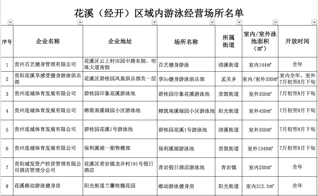 盛夏时节,暑气渐浓,为满足市民朋友们亲水消暑、健身休闲的需求,区文体广电旅游局梳理了花溪(经开)区域内各游泳池开放的详细信息,方便市民朋友选择。