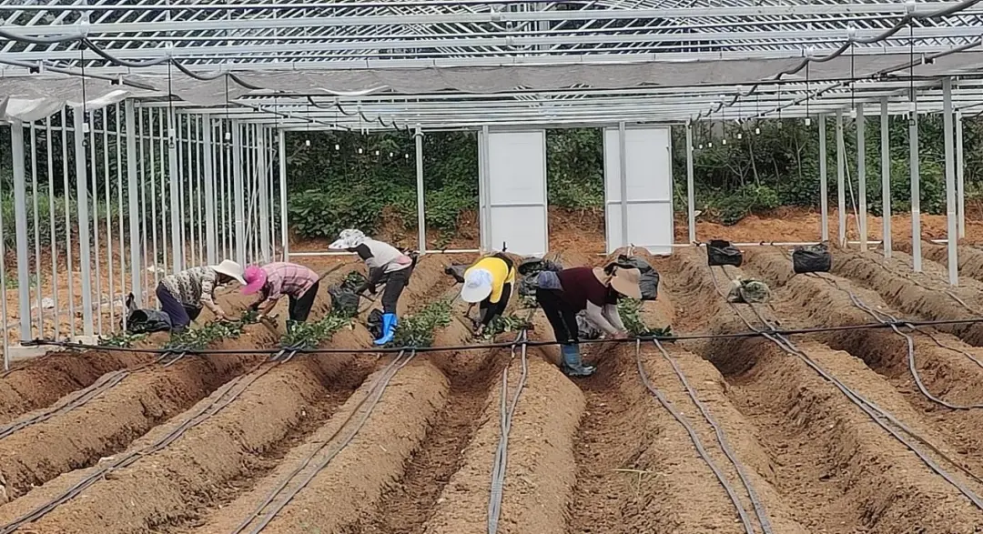在种植基地,农户严格按照技术规范进行操作,确保草莓苗根系舒展、株距合理,定植后及时浇灌定根水,有效提高幼苗成活率。