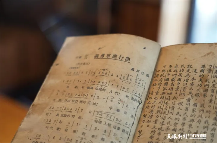 “这是抗战时期贵州开展扫盲教育与抗战宣传的教材。”周沧海翻开课本,第一课便是《中国人》,他朗声念道:“我是中国人,你是中国人,他也是中国人,中国人爱中国。”课本末尾还附有《义勇军进行曲》的曲谱,“1938年时,这首歌已广为传唱,不断唤起民众的抗日斗志。”
