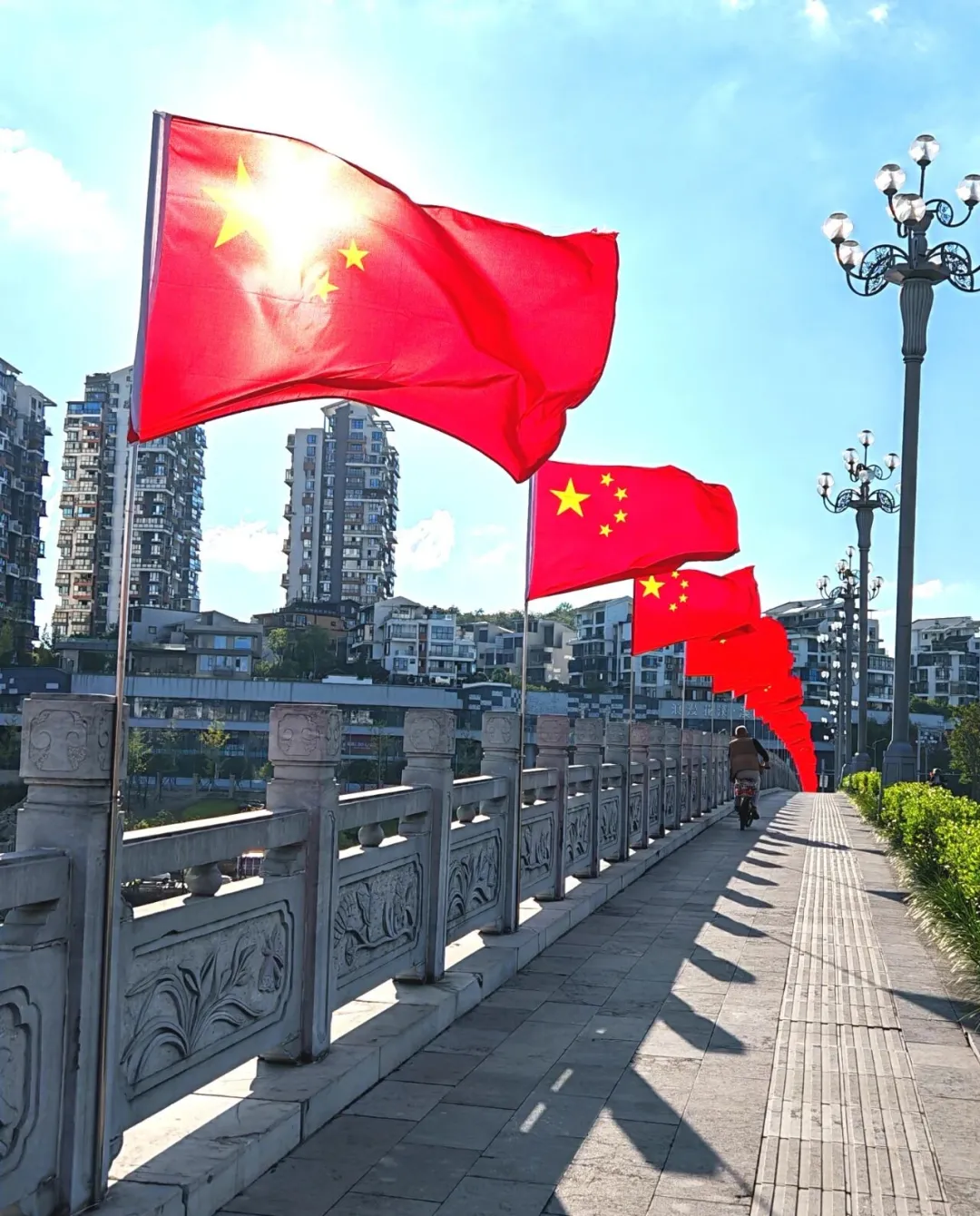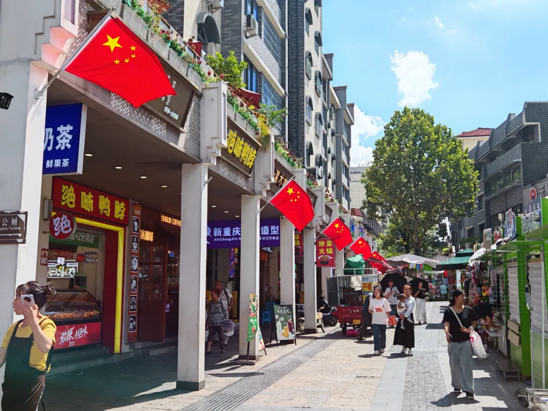 国庆节将至,秀美花溪已披上节日的盛装,处处洋溢着喜庆祥和的氛围。大街小巷,一面面鲜艳的五星红旗迎风招展,清溪路、田园路等主干道两侧整齐悬挂的国旗,汇成一道道流动的红色风景。步入花溪十字街等繁华街区,沿街商铺也纷纷缀上节日的妆点,门头红旗整齐排列,浓郁的家国情怀扑面而来。