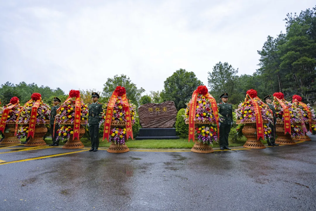 秋日的缅怀园,小雨绵绵,松柏青翠,庄严肃穆。在纪念墓碑两侧,社会各界敬献的11个大型花篮整齐排放,花篮红色缎带上题写的“英雄烈士永垂不朽”八个大字格外醒目,寄托着对英雄烈士的无限敬仰和深情追思。
