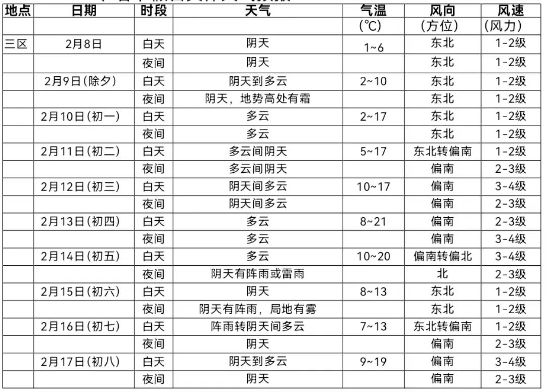2.春节假日期间“三区”天气多变,气温变化较大,请注意适时增减衣物,谨防感冒。
