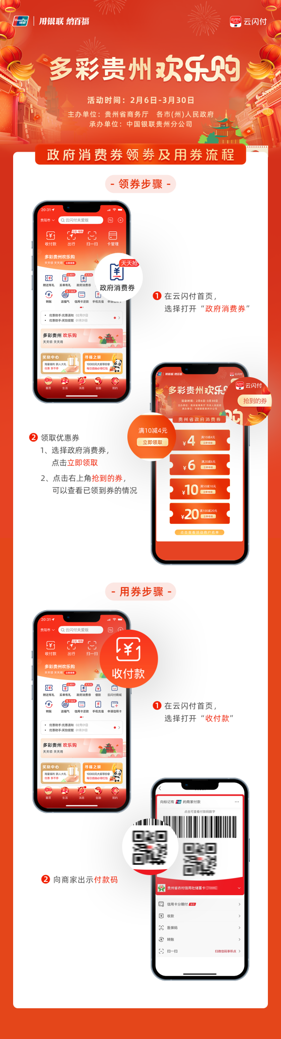 本次普惠消费券发放活动由贵州省商务厅、各市(州)人民政府主办,中国银联贵州分公司承办。贵州省商务厅按照“精心、精致、精细”原则,定责、定岗、定人、定时、定标准,做好普惠活动宣传,并建立监督机制,对消费券交易进行实时监测,规范活动流程,合力营造热闹欢庆、安全稳定的春节消费氛围。