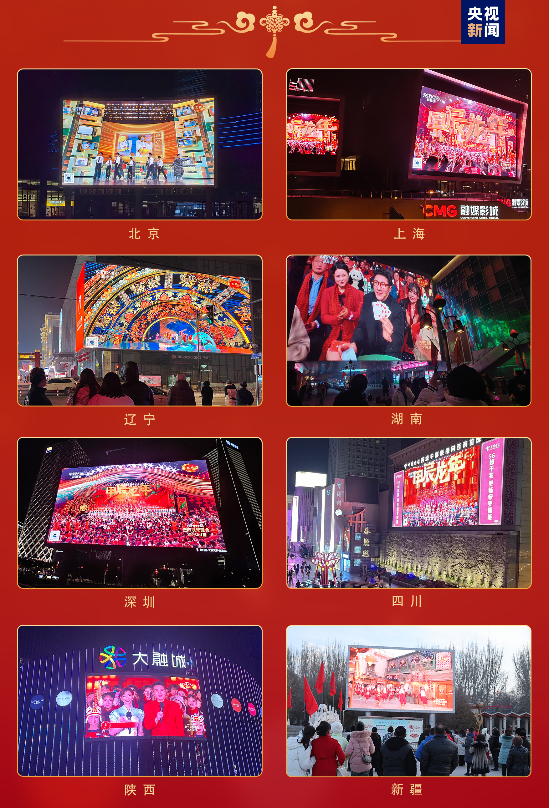 全球看春晚。作为联合国大会将农历新年列为联合国假日后的首个新年,总台主办的“春晚序曲 全球看春晚”活动在美国、肯尼亚、瑞士等多国举办近40场;各大洲49个国家、90座城市的3000余块公共大屏直播和宣介总台春晚;世界最高建筑迪拜哈利法塔、非洲第一高楼埃及新行政首都中央商务区标志塔、瑞典斯德哥尔摩市中心国王花园广场、巴西多娜·琳杜公园等多个全球地标性建筑上演春晚灯光秀……灵动吉祥的“龙辰辰”将中国新年的美好祝愿传遍全球。
