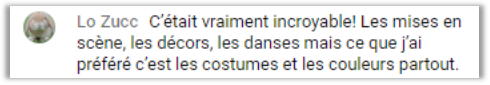 法国网友Lo Zucc留言 :“这简直难以置信!舞台上的演出,灯光道具装饰,还有舞蹈,但我最喜欢的是演员们的传统服饰以及多彩缤纷的绚丽颜色。”