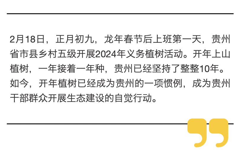 开年上山植树,一年接着一年种,贵州已坚持整整10年。这是深入践行习近平生态文明思想的重大举措,是深化落实习近平总书记对贵州守好发展和生态两条底线殷切嘱托的实际行动。