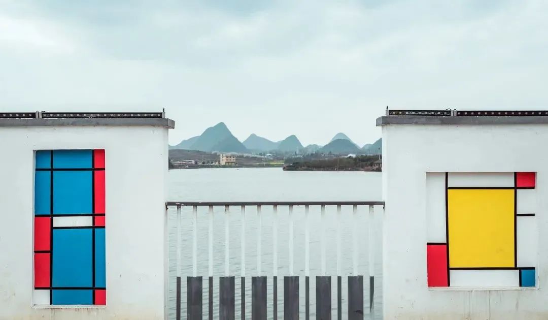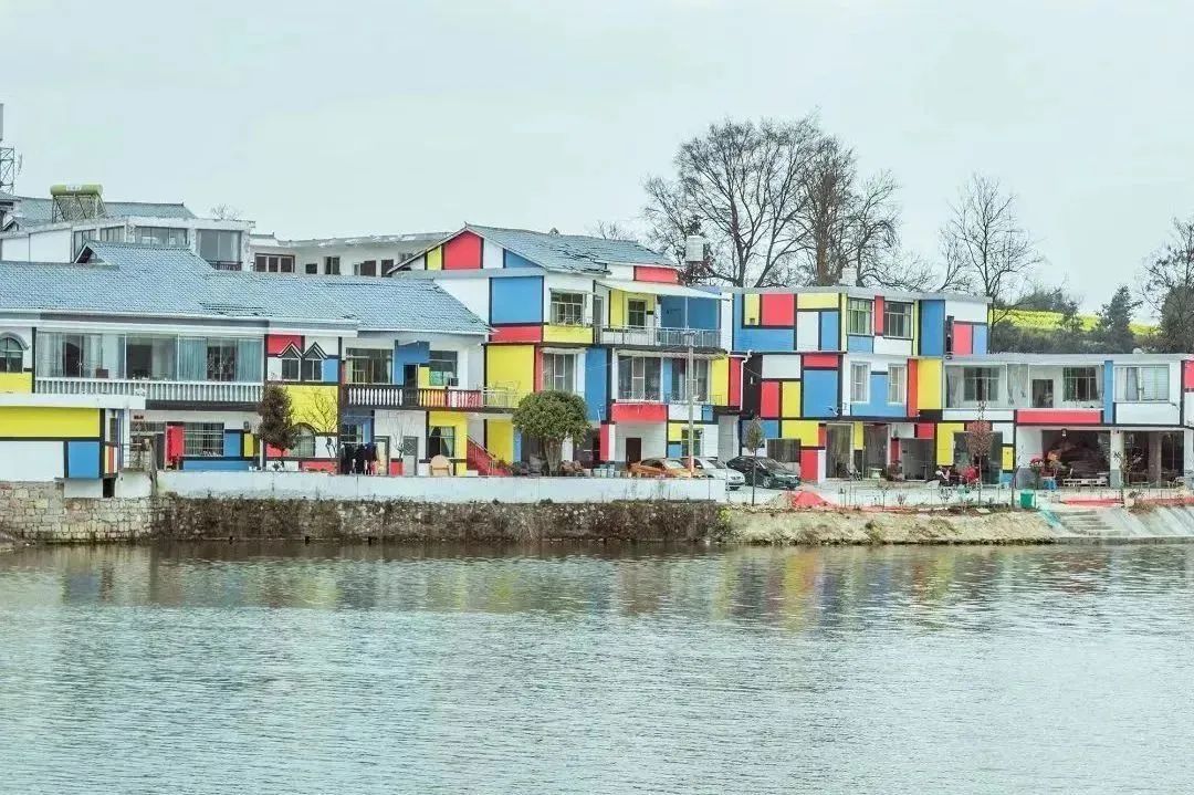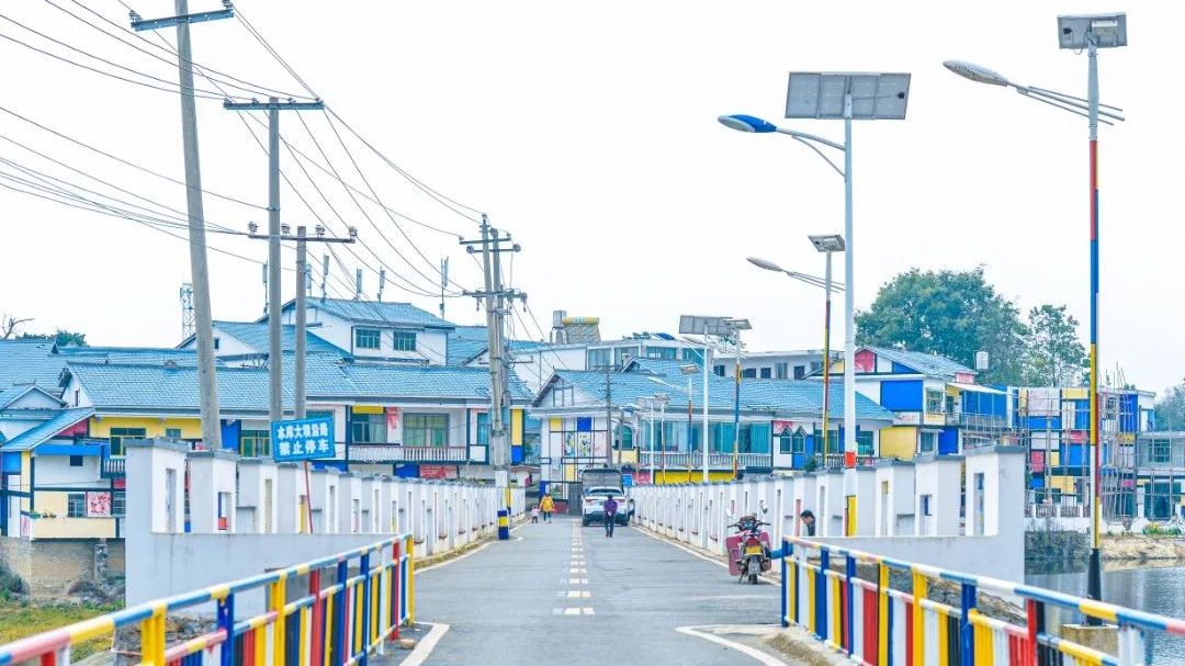 湖畔一排彩色的房屋错落有致,村里靠一座小桥与外界联系,短短百余米的桥面涂满颜色,成为热门打卡地。桥下湖水荡漾,远方群山巍巍,蓝天白云之间斑斓的颜色格外清新。
