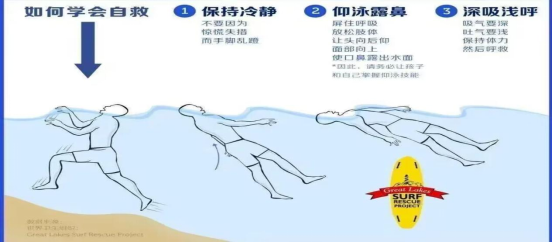2、放松全身,让身体飘浮在水面上,将头部浮出水面,用脚踢水,防止体力丧失,等待救援。