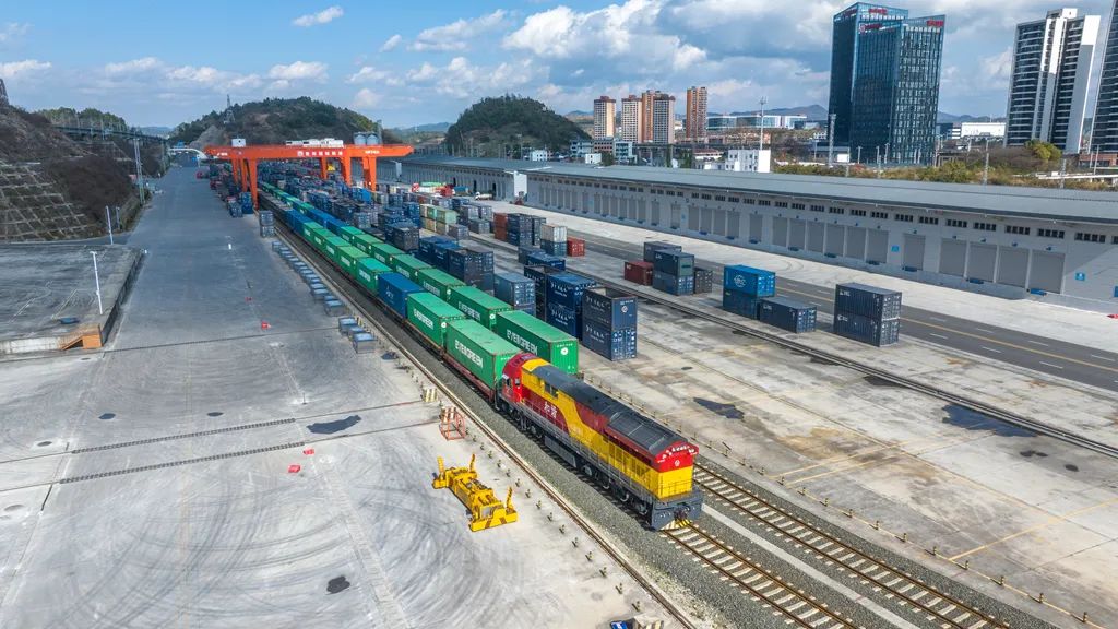 ▲ 1月18日,今年贵州开行的首列中欧班列从贵阳国际陆港都拉营站驶出(资料图片)