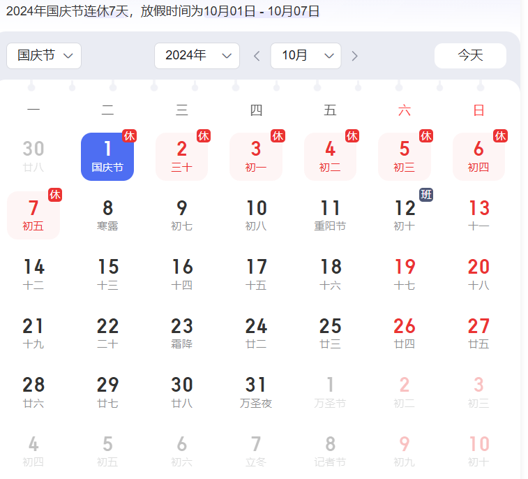 根据《国务院办公厅关于2024年部分节假日安排的通知》,2024年国庆节的放假调休安排如下:10月1日至7日放假调休,共7天。9月29日(周日)、10月12日(周六)上班。