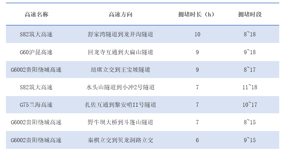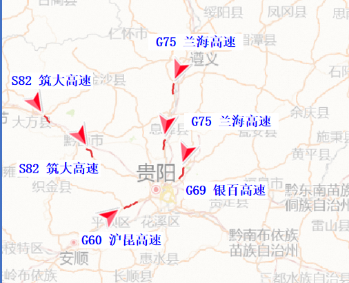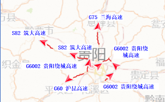 出程高峰时段,预计S82筑大高速、G60沪昆高速、G6002贵阳绕城高速、G75兰海高速等部分路段易出现拥堵缓行。建议行驶到以下路段的车主时刻注意路况,及时躲避拥堵。