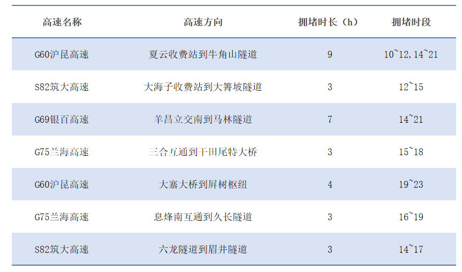 返程高峰时段,预计G60沪昆高速、G75兰海高速、G69银百高速、S82筑大高速等高速的部分路段易发生拥堵 。建议行驶到以下路段的车主时刻注意路况,及时躲避拥堵。