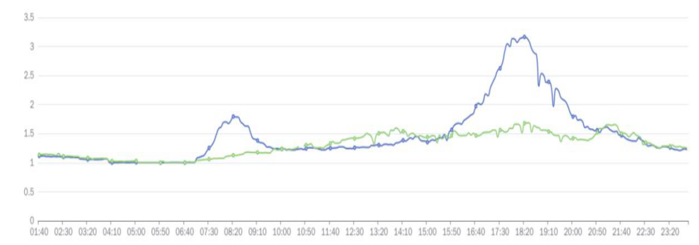 9月30日(蓝线)与日常(绿线)交通拥堵指数走势对比预测图