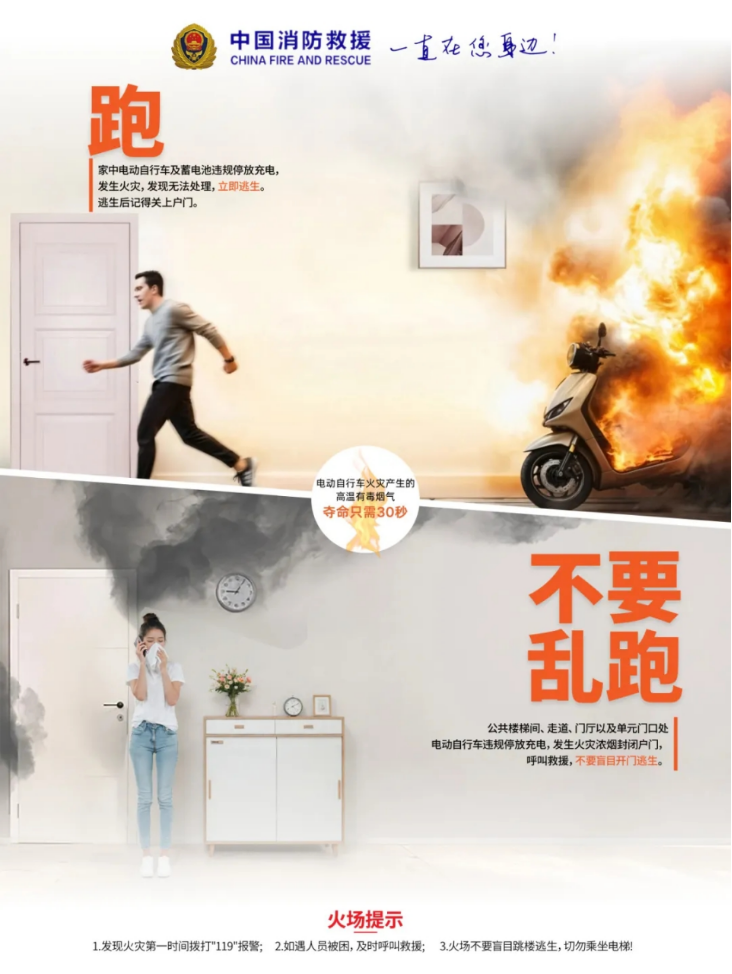 家中电动自行车及蓄电池违规停放充电,发生火灾,发现无法处理,立即逃生。逃生后记得关上户门。