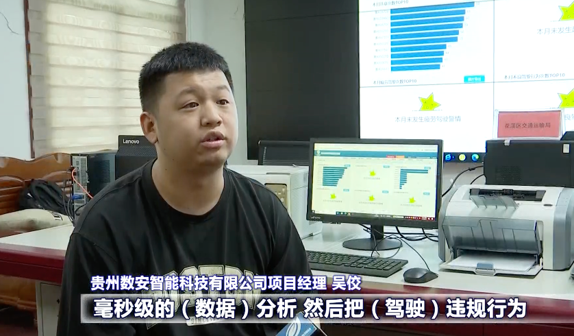 贵州数安智能科技有限公司项目经理 吴佼:基于后台的大数据模型和人工智能算法进行秒级的数据分析,把驾驶违规行为自动存档及记录到平台上,反馈给执法人员,执法人员根据我们分析的数据有针对性地进行管理,一个人可以同时识别1万辆车,实时运用到九大安全隐患识别,比如不良驾驶、超速、违规停靠、违规代班等。