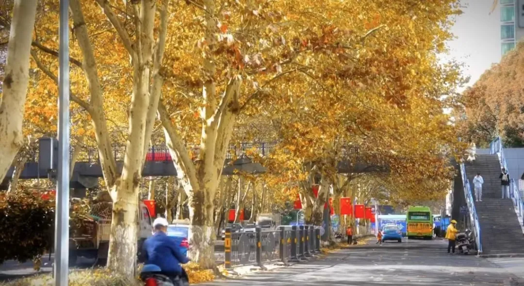 待道路两旁满是金黄时漫步其中树叶随风而落将整条人行道铺成金黄的地毯亲近感受贵阳秋意的浪漫