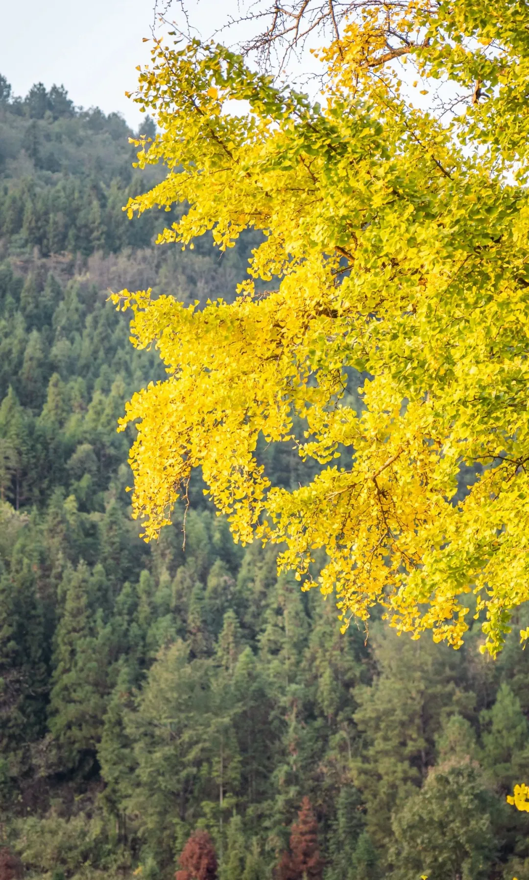 秋风吹过银杏叶散落在山野之中站在这里的观景台上自由惬意地看看这里秋叶的黄,山间的景心旷神怡,没有烦恼
