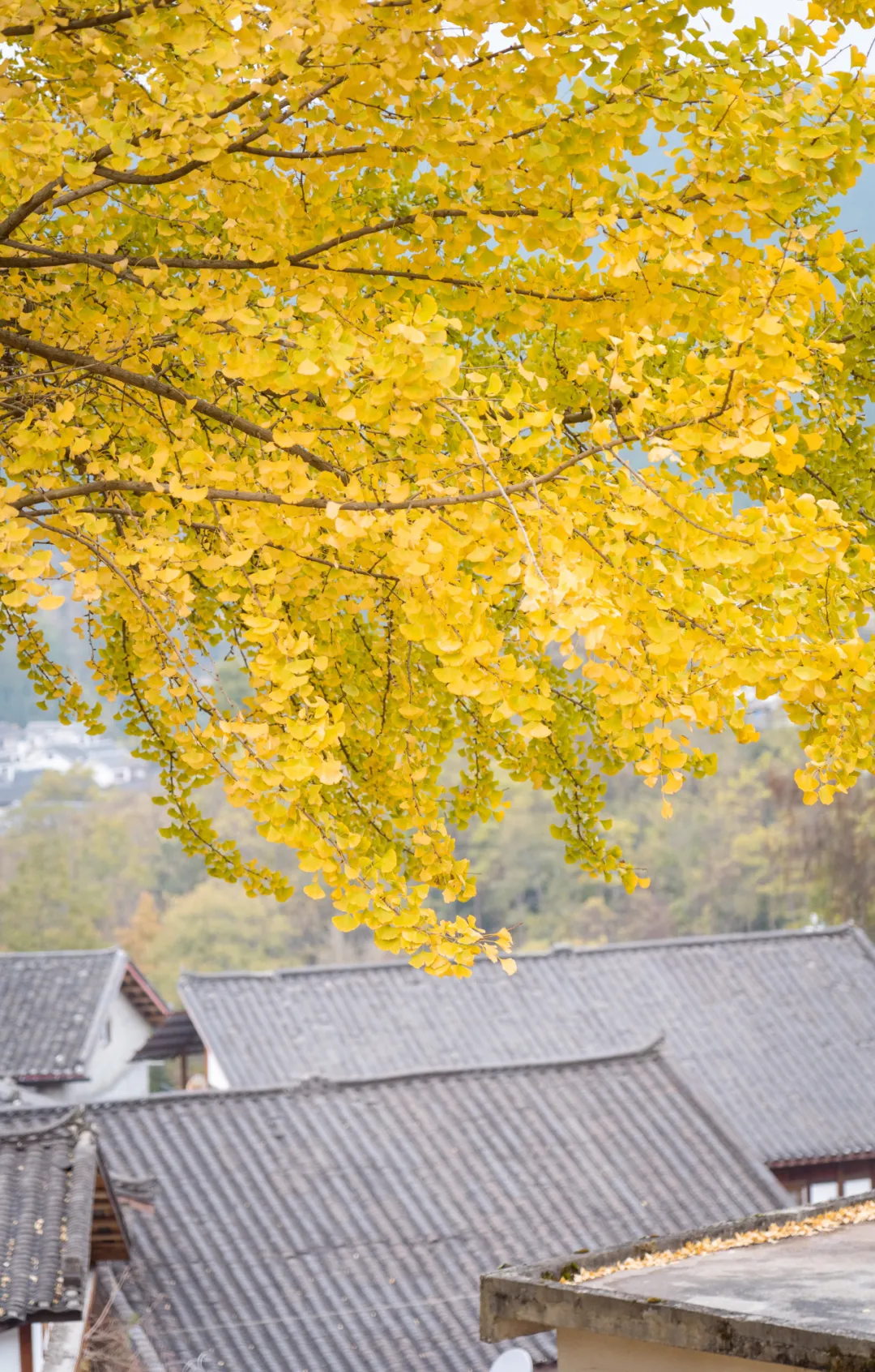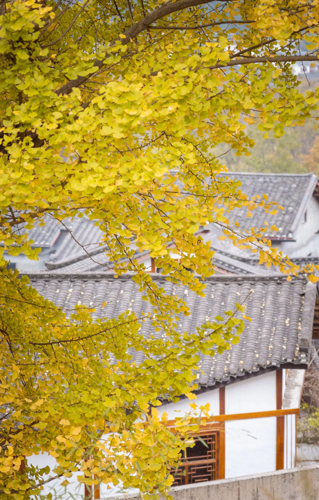 当秋风吹黄了树叶镜头下的银杏树与阡陌小道中的房屋交叠那黑顶白墙背景下的片片金黄是秋季的温柔与惬意