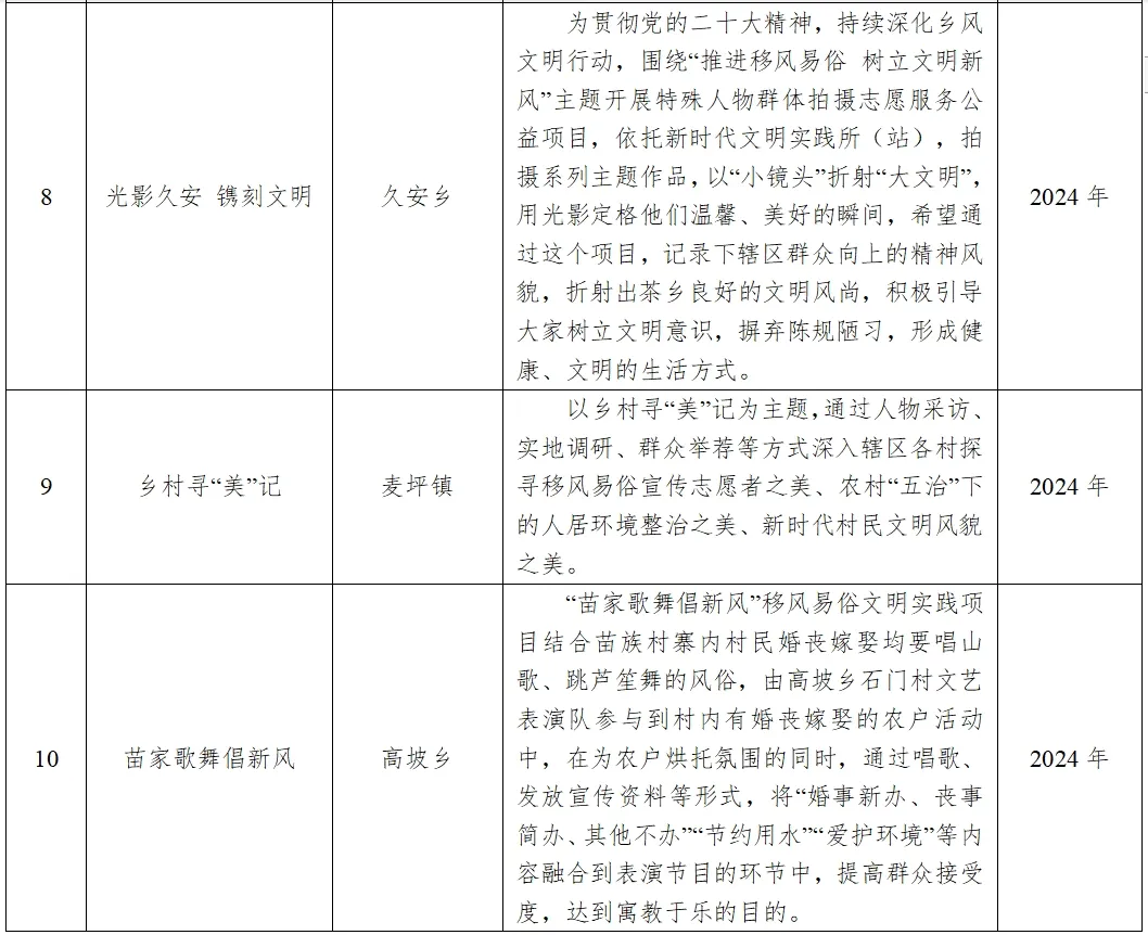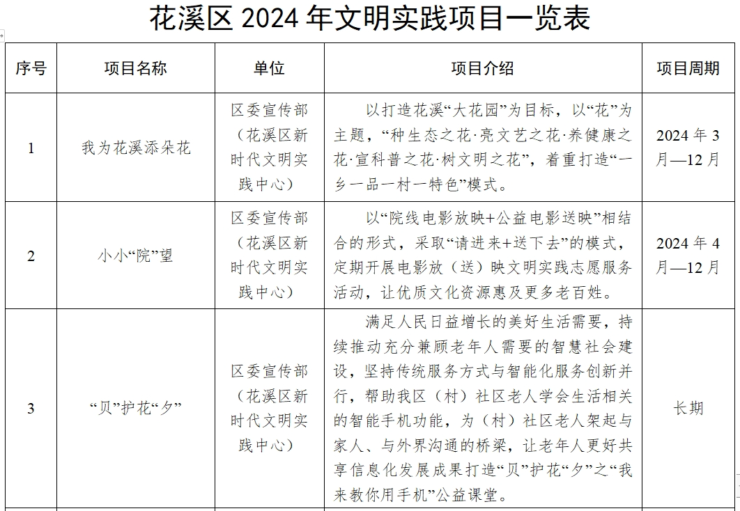 为全面深化拓展文明实践内容、形式、途径和方法,着力打造基层思想政治工作的主平台、文化传承发展的新载体、党和人民群众的连心桥,在新起点上推动新时代文明实践中心建设高质量发展。围绕“ 举旗帜、聚民心、育新人、兴文化、展形象” 的使命任务,2024年,花溪区新时代文明实践中心联合区融媒体中心以“ 树文明新风·做时代新人”为主题,开展新时代文明实践项目“擂台大比武”,活动时间为2024年4月至12月。按照“一村一特色、一乡一品牌、整区同推进、月月有活动、群众都参与”的要求,特向辖区群众展示、征集花溪区2024年文明实践项目。点击下方图片查看花溪区2024年已收集到的文明实践项目,更多文明实践志愿服务活动等你来参与!